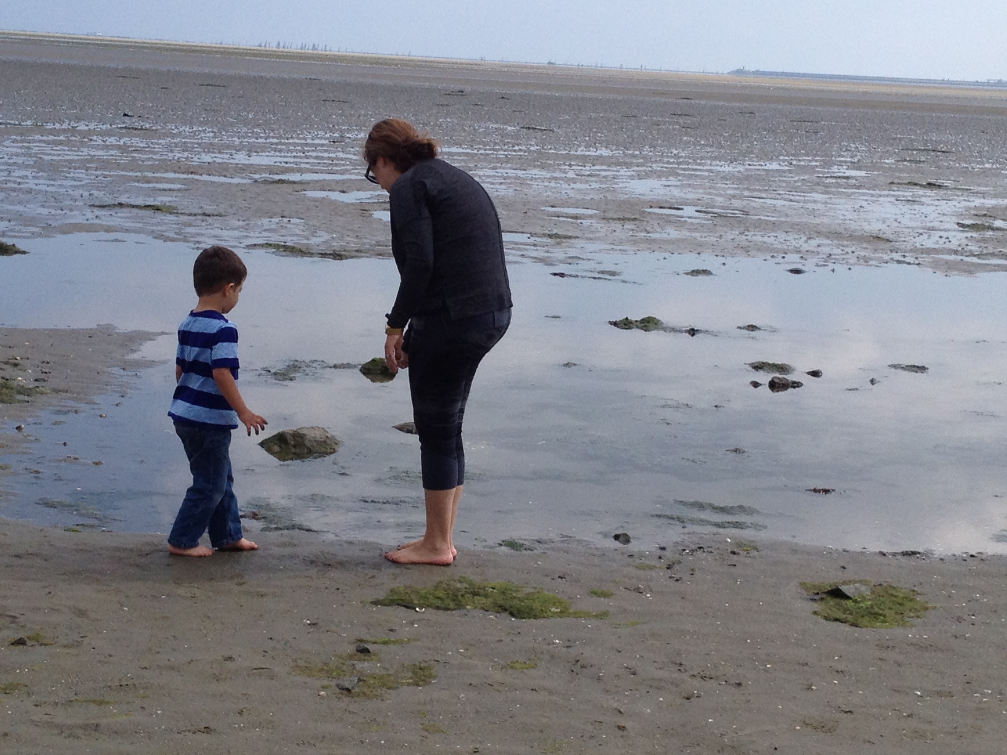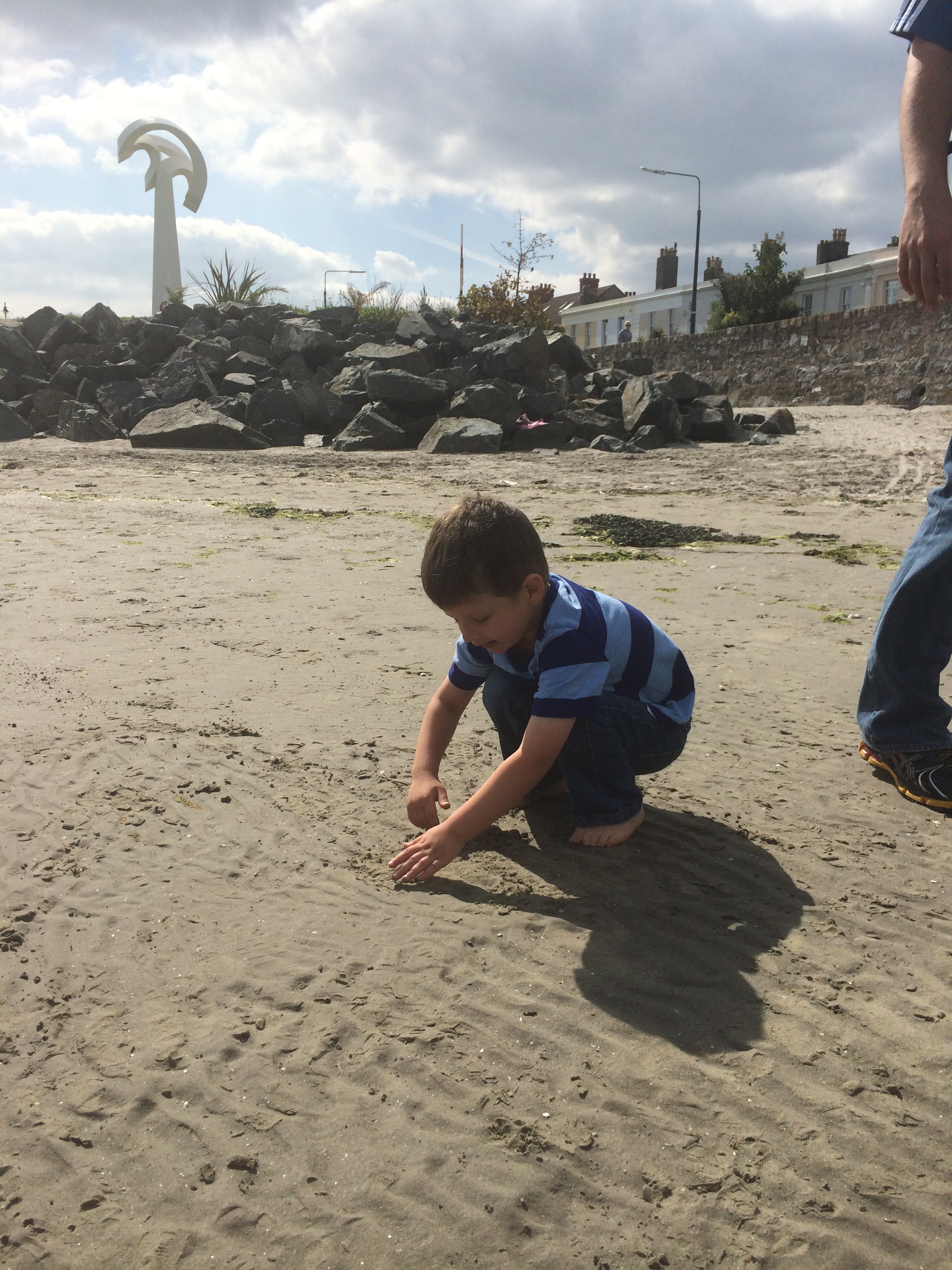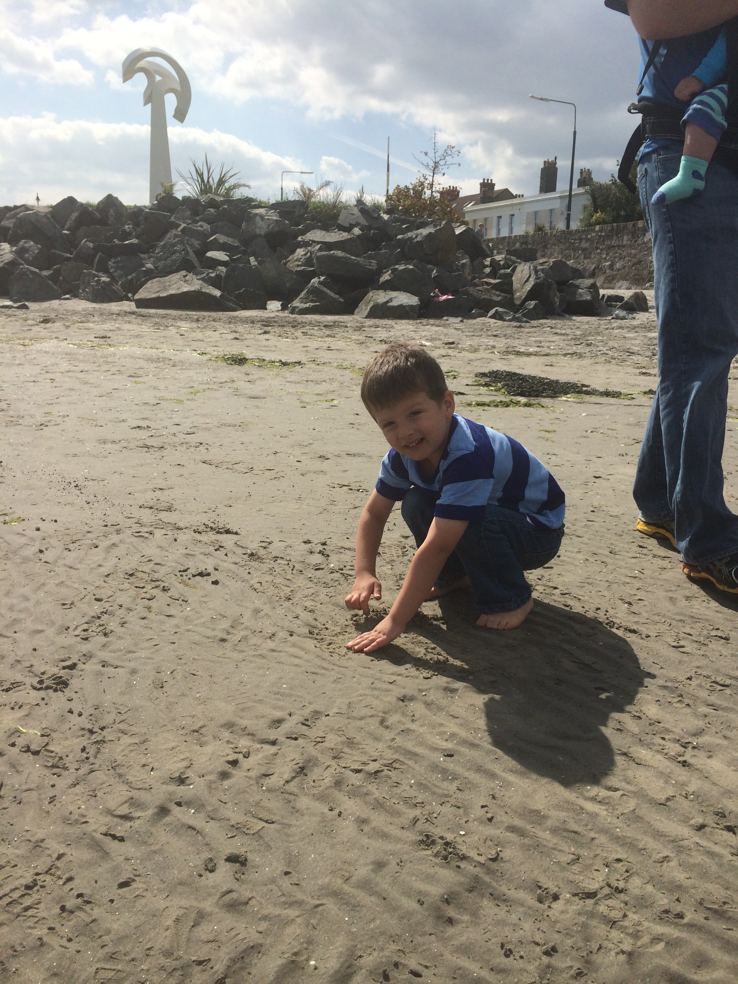 A few minutes walk from Sandymount village/green is the water. We walked over to the beach and walked along Sandymount Strand, which is a big sandy stretch that goes for miles. James Joyce references this beach twice in his novel Ulysses, so it’s said to be the most famous beach in Irish fiction. The tide goes really far out, too, so you can walk far out among tide pools and sand bars. People walk their dogs along, jog, or fly kites. We just plopped down in one place and Isaac dug in the sand for awhile (even without a bucket and shovel…just used his hands), collected shells, and threw rocks in the water. It was a blast! Definitely going back there another day.
