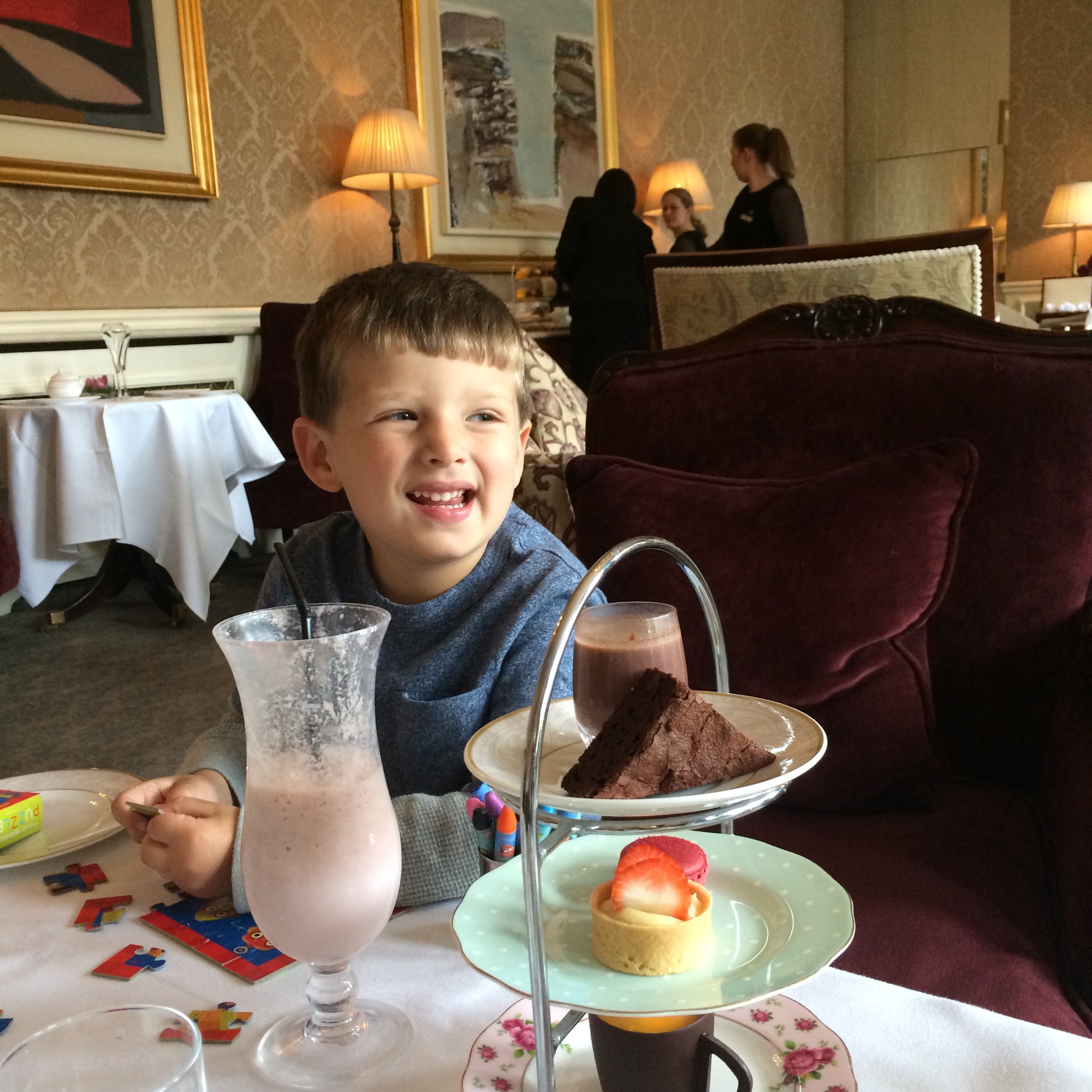 The tea included delicious sandwiches, scones, treats, and of course…tea! Isaac had the children’s tea, which had a milkshake, kid friendly sandwiches, and various cookies and brownies and hot chocolate. It was total indulgence for all of us, and a memorable experience!