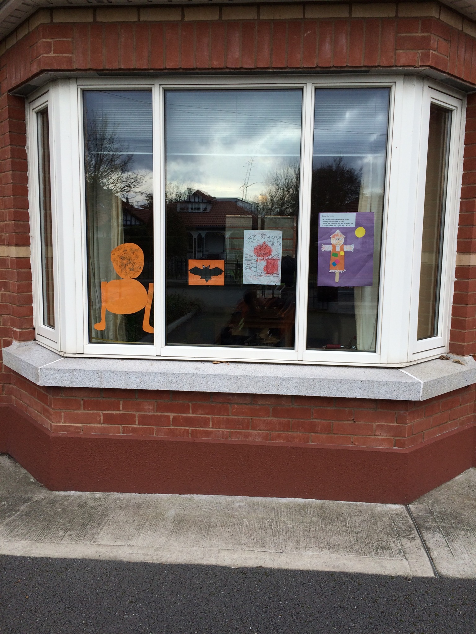 We had a fun Halloween here last week! It seems like Halloween is a really big deal here in Ireland. It actually supposedly originated here in 5th century B.C. with the Celts of Ireland. Once a pagan holiday called Samhain that celebrated the end of the year (which was on October 31st) and the beginning of the new year, it was a time of transition between old and new and so it was thought that spirits from the afterlife came back to visit then too. Eventually it became more Christianized, but still a lot of the traditions of Halloween (costumes to trick the spirits, trick or treating, and even jack o lanterns…supposedly named after an Irish guy named Jack O’Lantern 🙂 ) originate from the old Irish customs. So that may be why it’s such a big deal here. It seemed like for weeks in school, they were doing Halloween themed projects. All the local stores and lots of people’s homes were decorated. Here was our window decorations (mostly artwork isaac did at school)