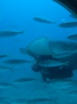 - A scuba diver swimming with a ray and fish
