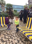 - Rafi by the funky colorful benches outside the aquarium