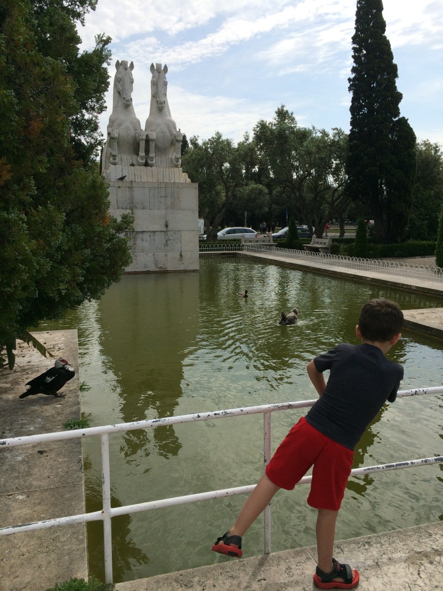 Isaac looking at ducks in the park across from Jeronimos Monastery
