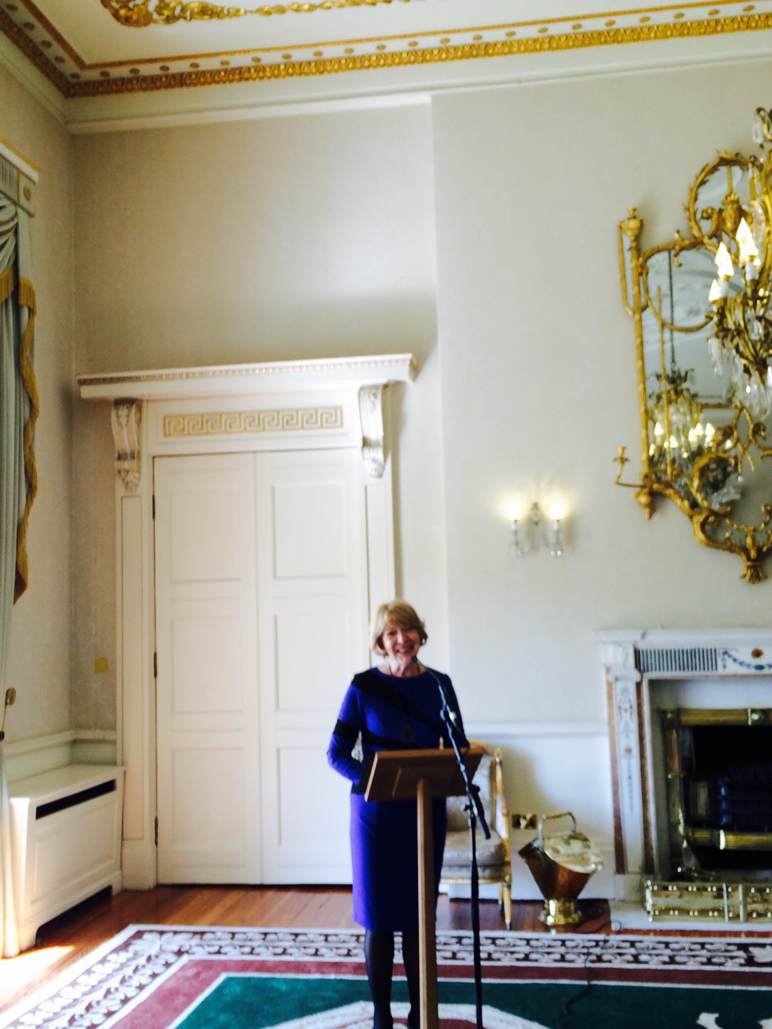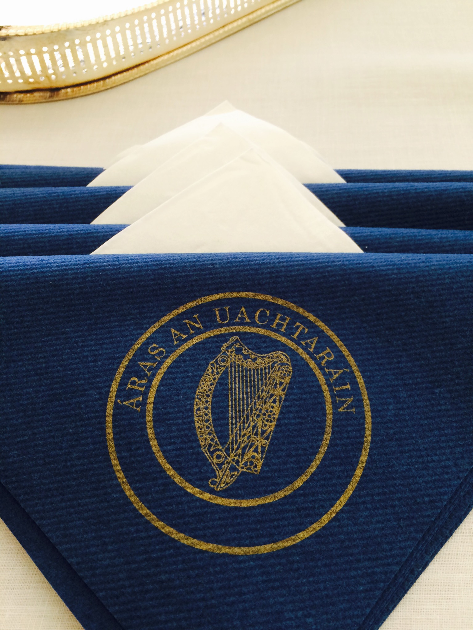 When we arrived, we were ushered into the largest of the rooms where heads of state are greeted (Obama, the Clintons, and Queen Elizabeth were all received in this room). We each got a picture taken with Sabina Higgins, the First Lady. I didn’t realize they would also be willing to take a photo with our own cameras, so I hadn’t pulled mine out in time — oh well! We proceeded into the dining room for a little reception with tea and coffee, goodies, and wine (at 11 in the morning?!), and Mrs. Higgins came around and mingled with all of us. She was very sweet and lovely and very welcoming to everyone.