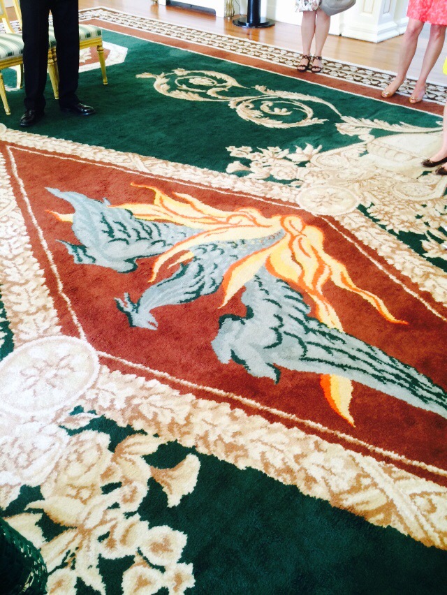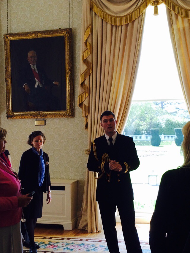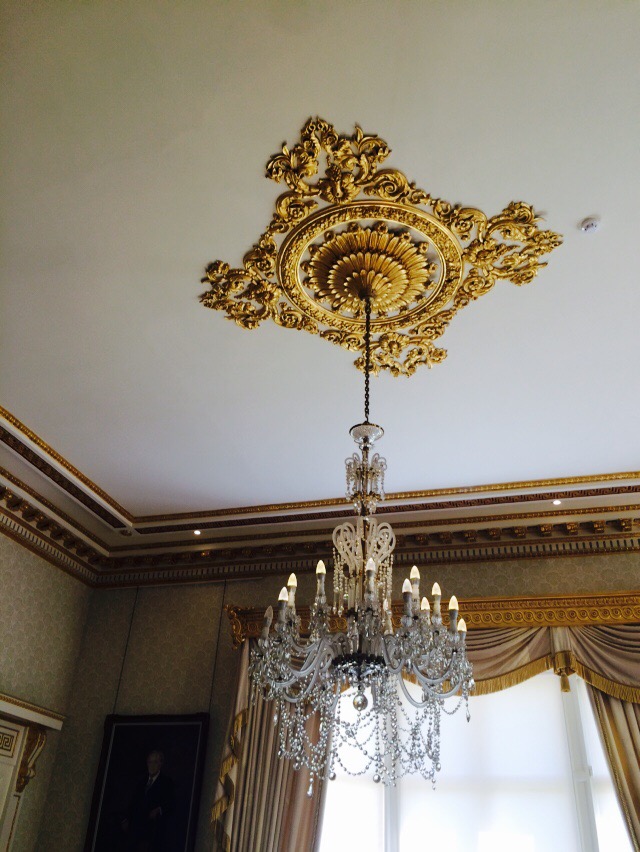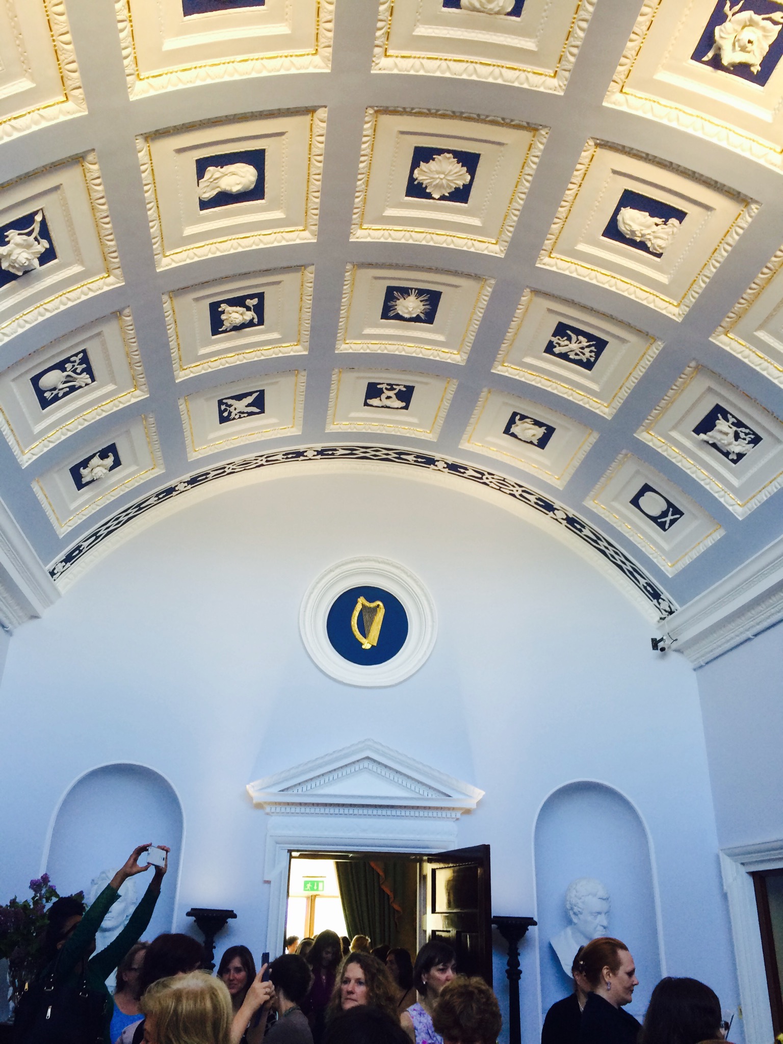 After she made her exit, we had a tour of the rest of the public rooms from a funny (and cute :)) guide who seemed to be part security detail and part public relations. He charmed all the ladies with his shpiel about the history of the house and each past president of Ireland. It was actually really interesting to learn about. The house had originally been built during English rule, and so when Ireland became independent there was talk of demolishing it (as it represented colonial rule), but they decided to preserve and renovate it to reflect symbols of the new free Ireland. In the artwork on the walls, the carpets, and the rococo plaster on the ceilings, there’s all kinds of symbolism of Ireland (shamrocks, the harp which is the official instrument of the country, a phoenix rising from the ashes which is meant to symbolize freedom).