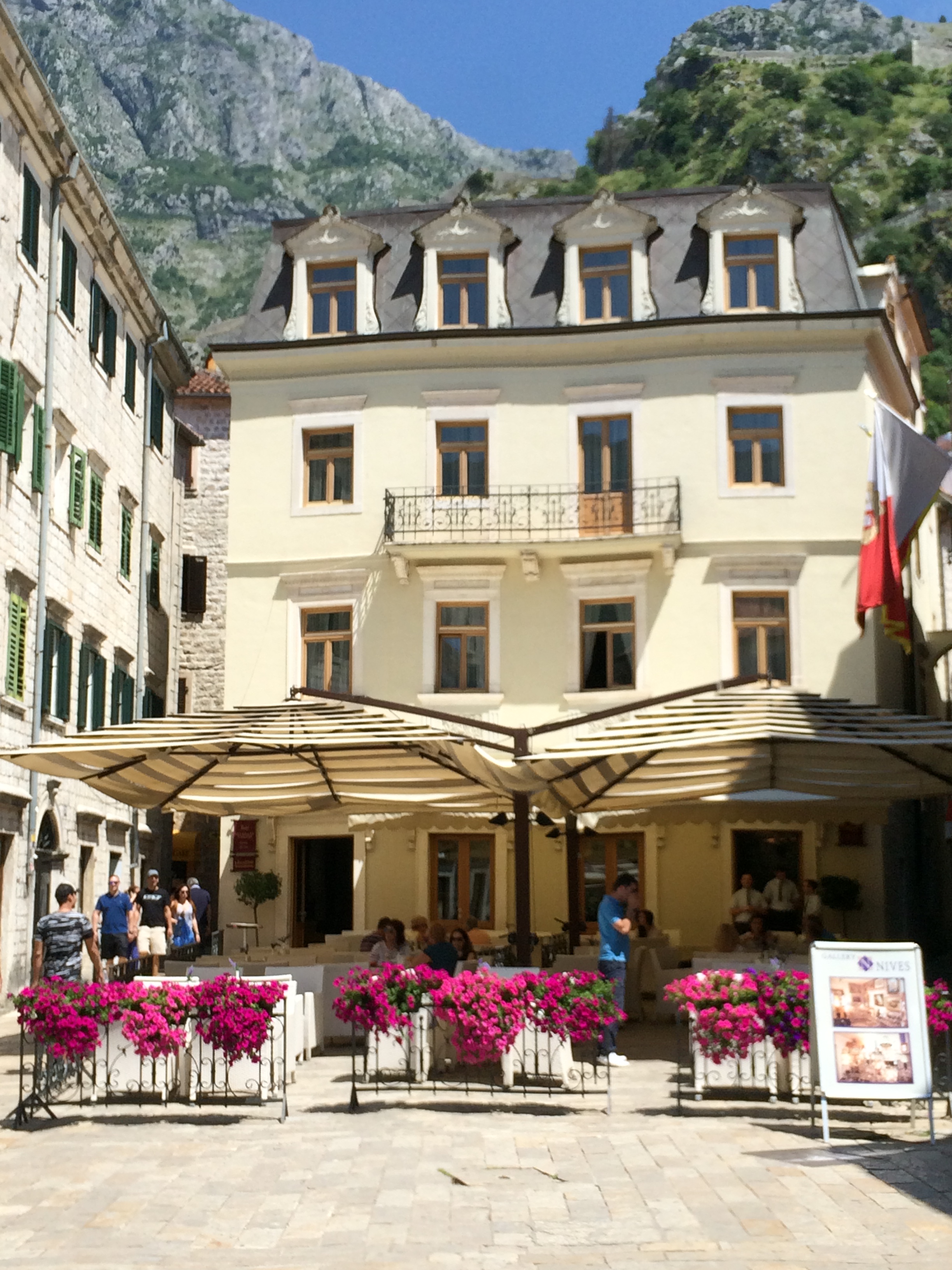 Colorful flowers on a cafe in old town Kotor