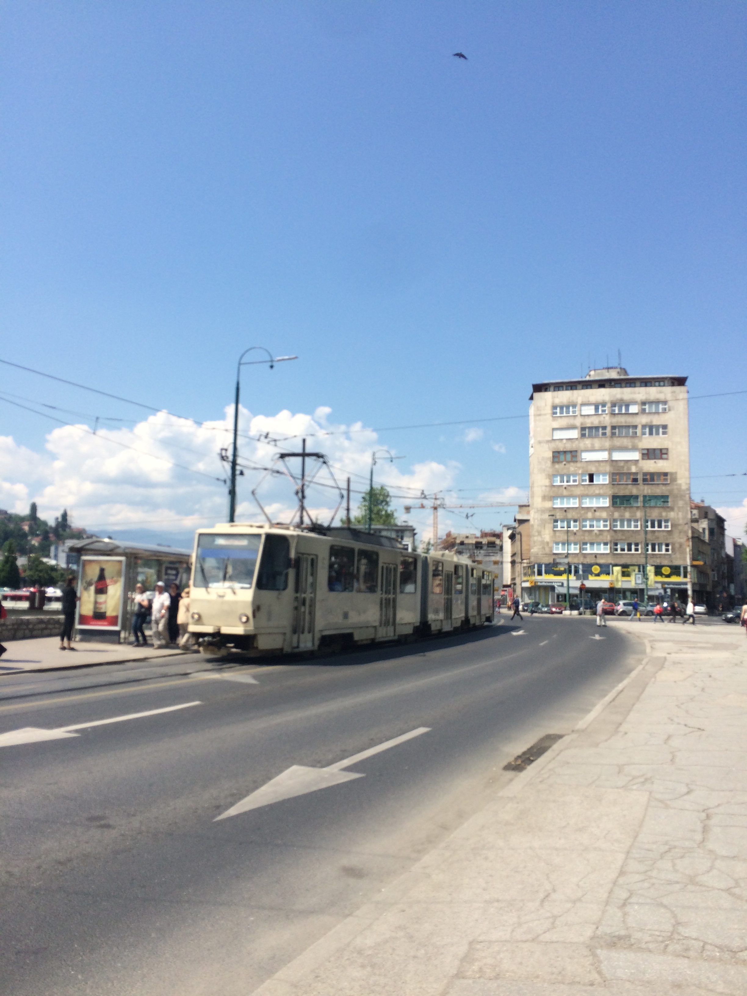 Communist style tram and building