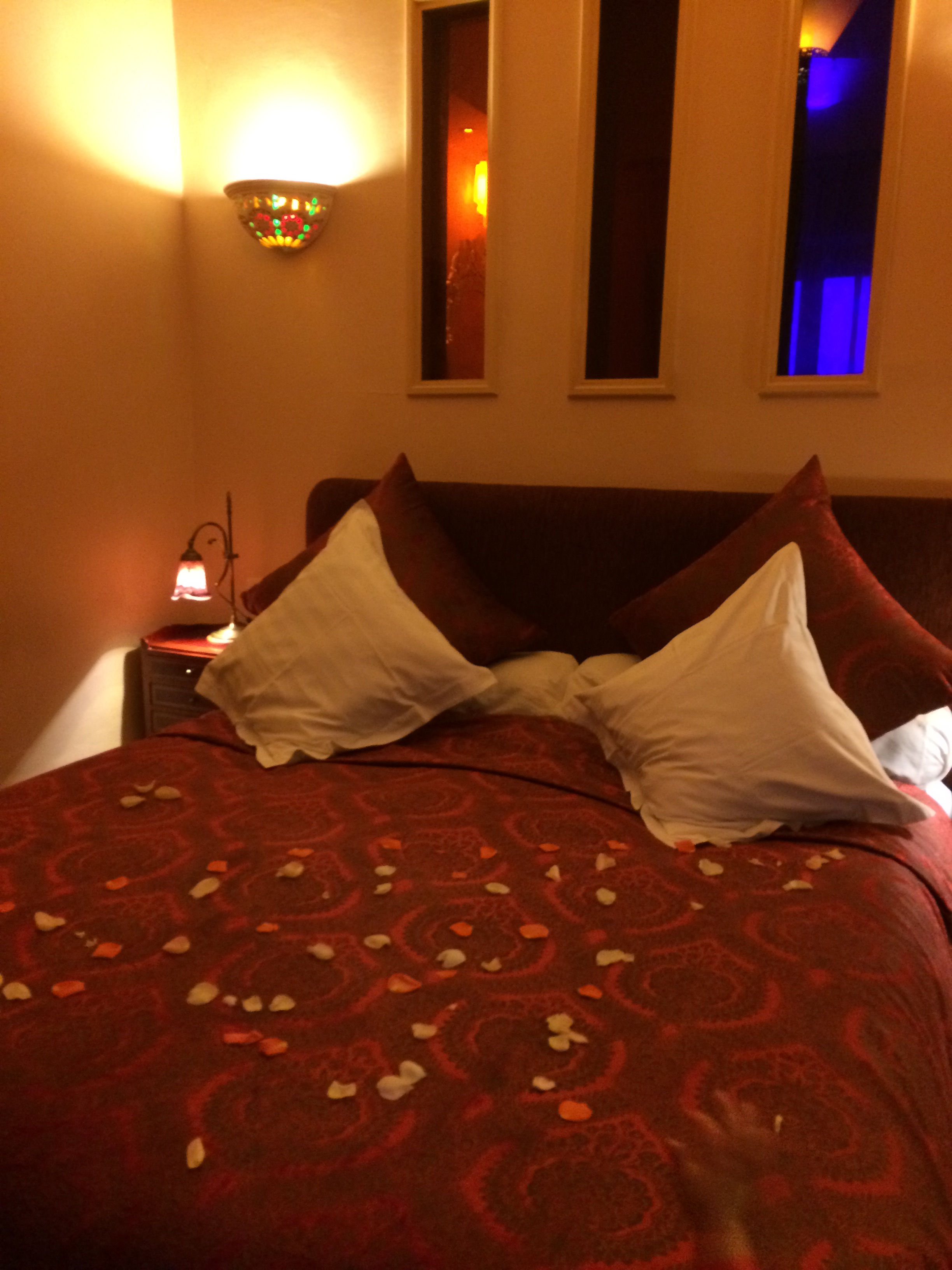 Our bed, covered with rose petals when we arrived